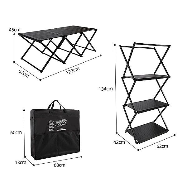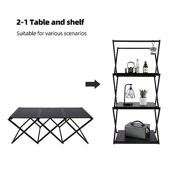 2-1 折りたたみテーブルとシェルフは、アウトドア活動のために設計された多機能機器です。 コンパクトで軽量なデザインなので、キャンプ、ピクニック、その他のアウトドアアドベンチャーに最適です。