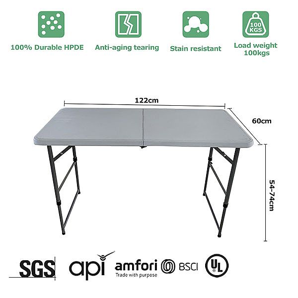 調節可能な屋外折りたたみテーブルは屋外愛好家のための理想的な選択です。この折りたたみテーブルは3段階の高さ調整が可能で、特定のニーズや好みに合わせてカスタマイズできます。半分に折りたたむデザインは占有スペースを減らします。持ち運びハンドルのデザインがあり、持ち運びや保管が簡単です。つまり、キャンプ旅行やピクニック、さらには公園で快適な一日を過ごすときにも簡単に運ぶことができます。耐久性に優れたHDPE製で、環境に優しく高温耐性があります。調節可能な屋外の折りたたみテーブルを使用すると、快適で簡単に屋外を楽しむことができます。その汎用性と適応性は、すべての屋外アドベンチャーに不可欠なアイテムです。