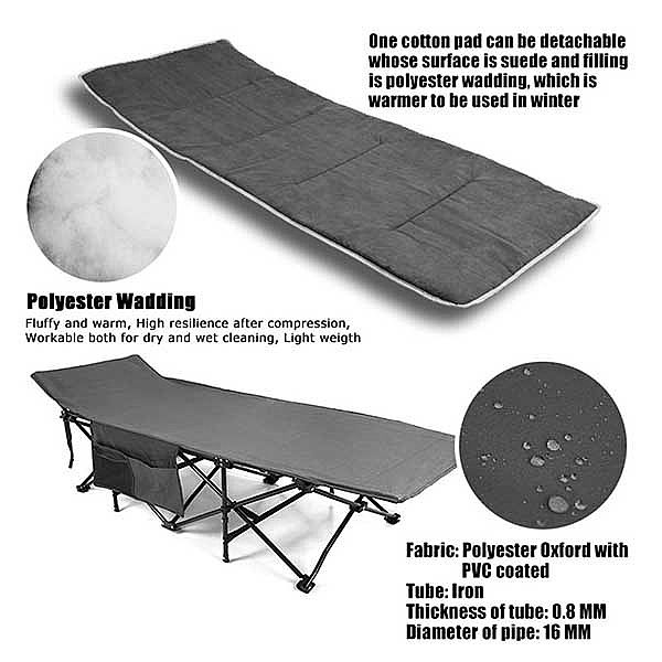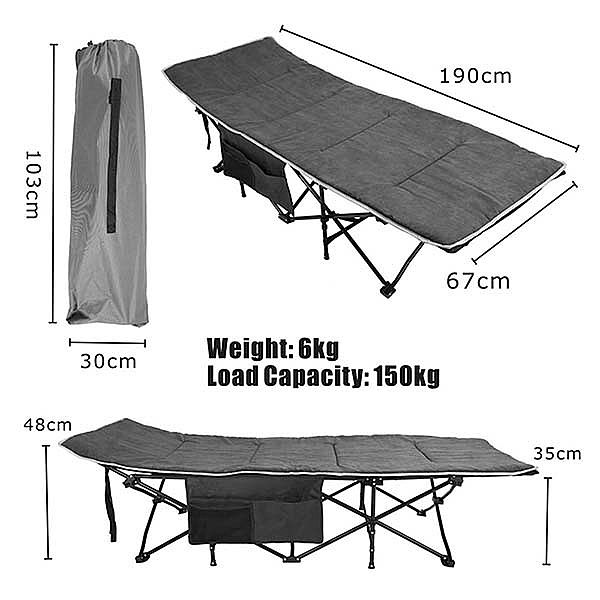 - ベッドは、PVCコーティングされた素材と厚さ0.8mmのパイプを備えたポリエステルオックスフォード生地で作られています。ジョイントとクランプは頑丈な素材で作られており、総重量/正味重量は 23 kg/22 kg です。展開時のサイズは190×67×35×48cm。